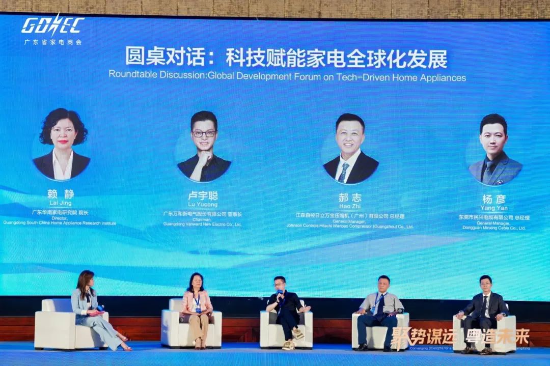 在科技赋能家电全球化发展圆桌论坛环节,广东华南家电研究院院长赖静、广东万和新电气股份有限公司董事长卢宇聪、江森自控日立万宝压缩机(广州)有限公司总经理郝志和东莞市民兴电缆有限公司总经理杨彦,围绕AI战略布局、产业链协同等话题展开了深入探讨与分享。